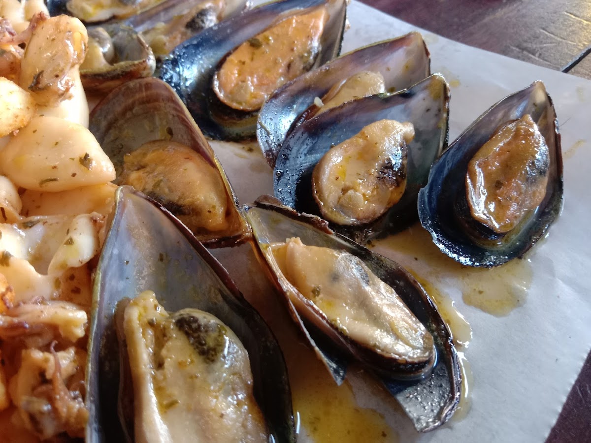 Calamari / Prawns / Mussels / Hake Fillet, served with a side of chips or salad.
