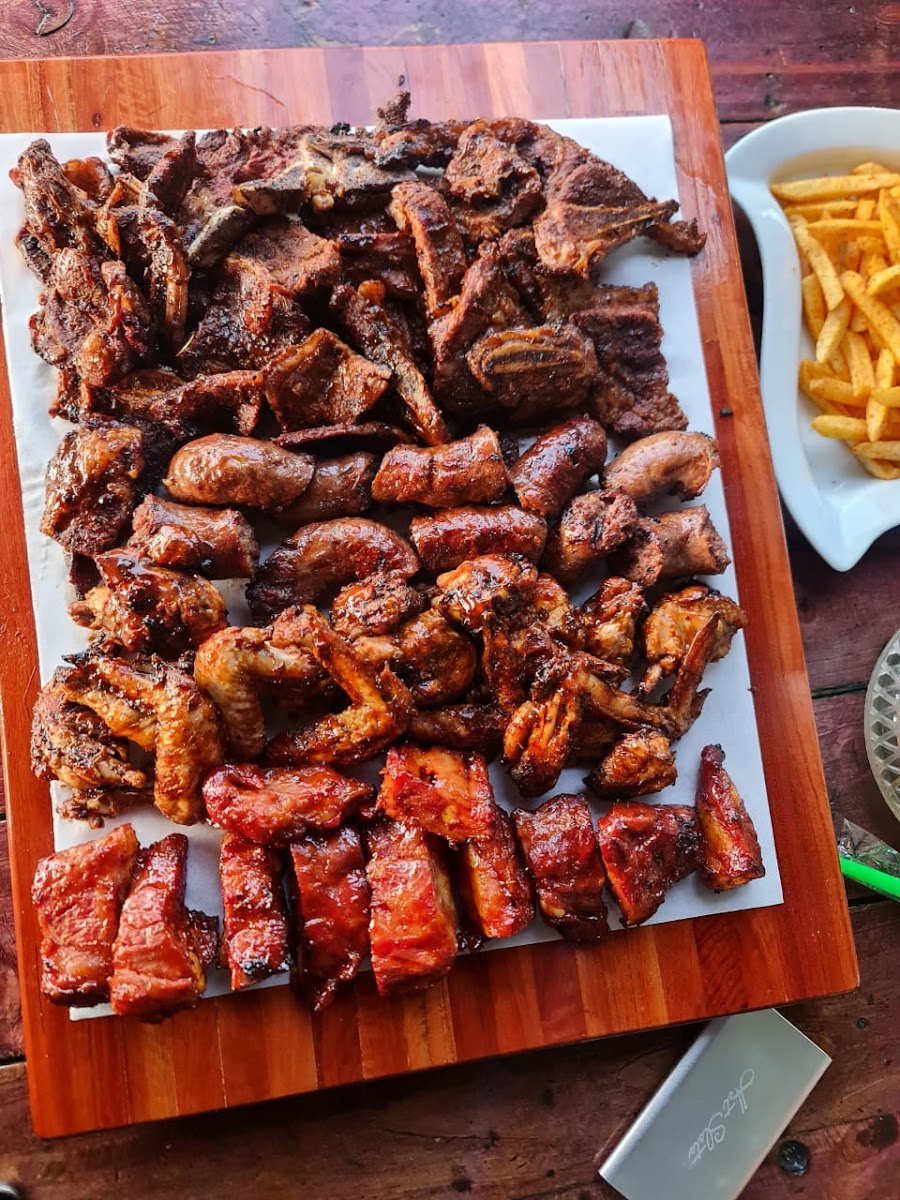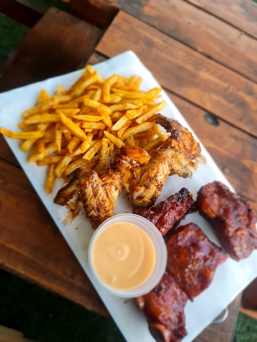 Meat Platter comprising: Wings / Ribs / Short rib / Chuck / Wors, and a side of pap and chakalaka, or chips or salad.